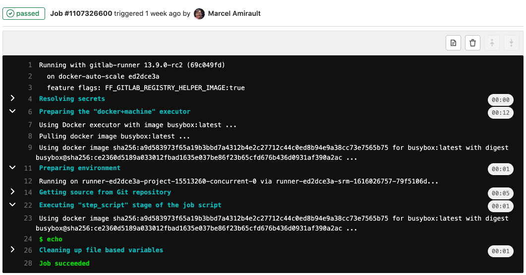 - In the pipeline view, in the list of jobs, select a job to view the job logs page.