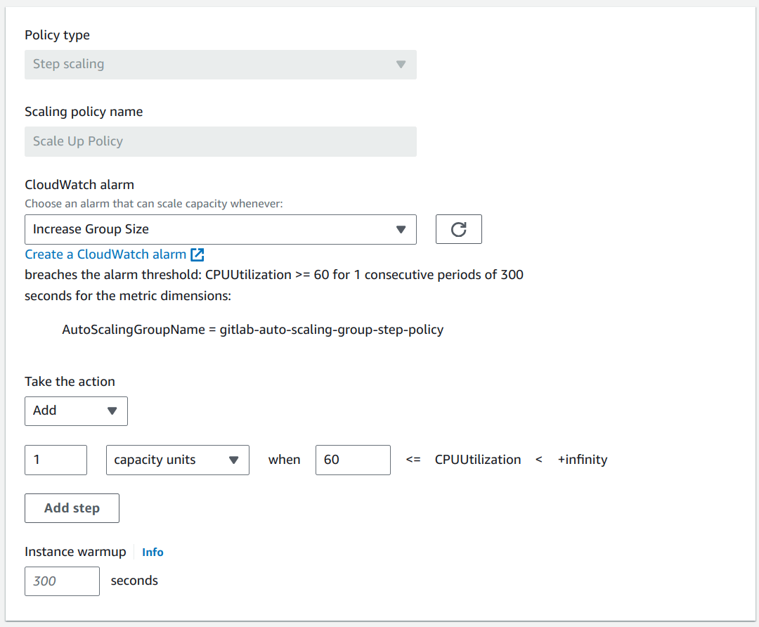 for metrics from EC2 instances By Auto Scaling Group we created earlier. - Create a scale up policy using the following conditions:
