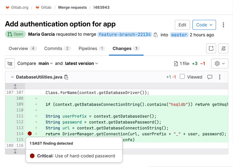 SAST results display in the merge request Changes view. Lines containing SAST issues are marked by a symbol beside the gutter. Select the symbol to see the list of issues, then select an issue to see its details.