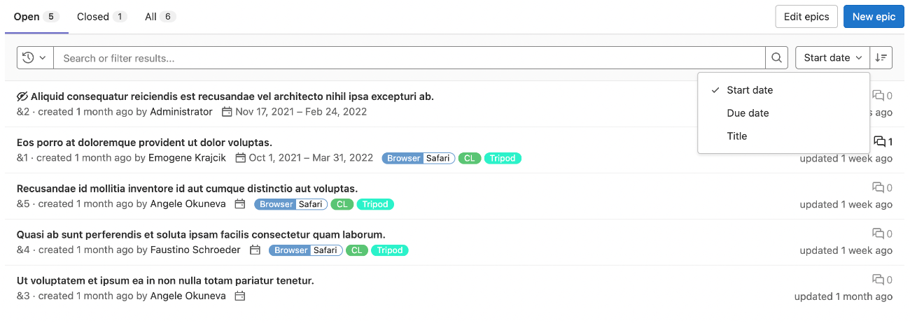 - For the start date: GitLab scans all child epics and issues assigned to the epic, and sets the start date to match the earliest start date found in the child epics or the milestone assigned to the child items.